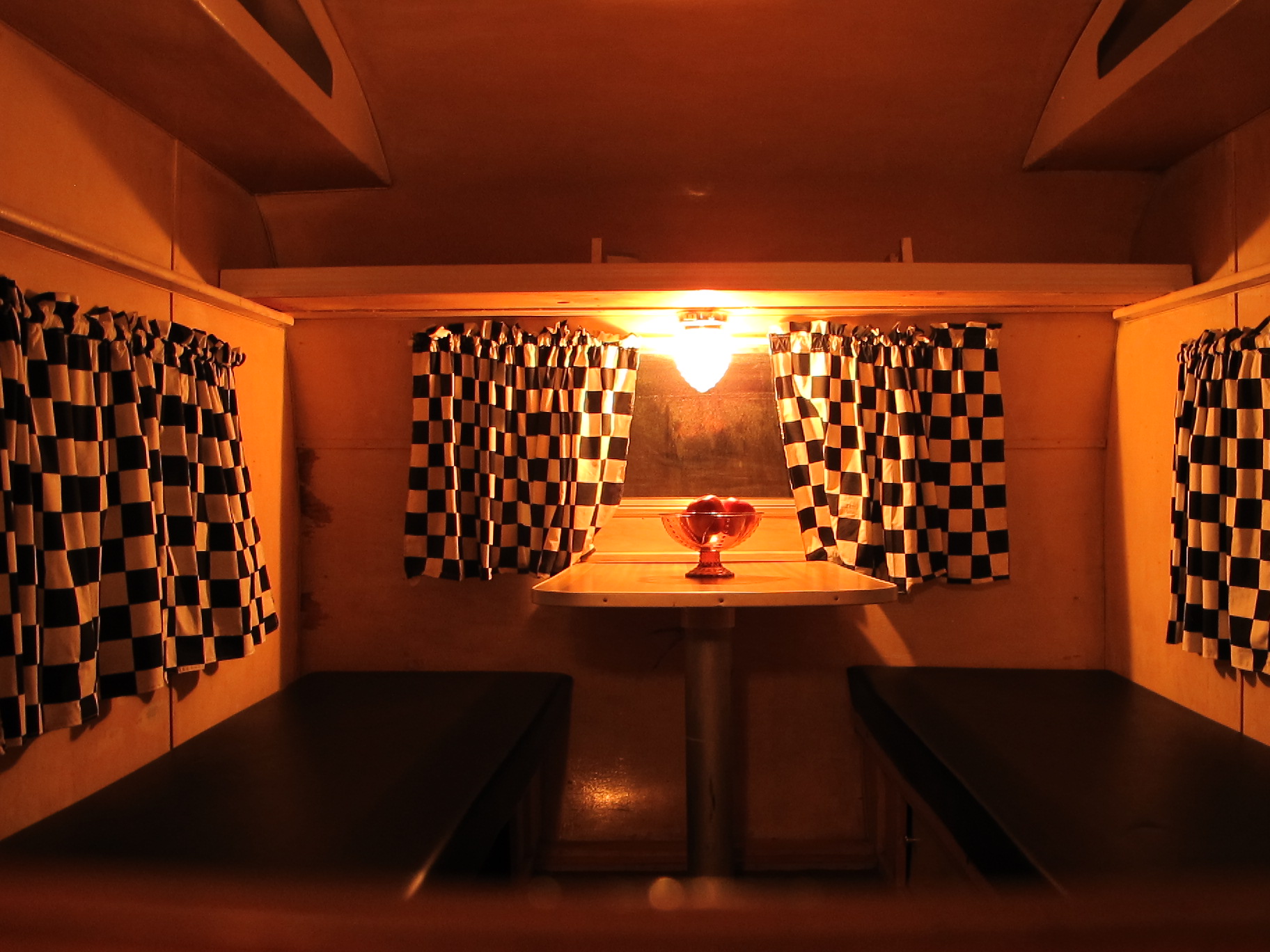 Here’s the kitchenette area. It has the original propane stove and oven as well as the ice box. You’ll also see the original gas lamp in the upper left corner. I don’t think I’ll use that since it probably gets pretty warm.