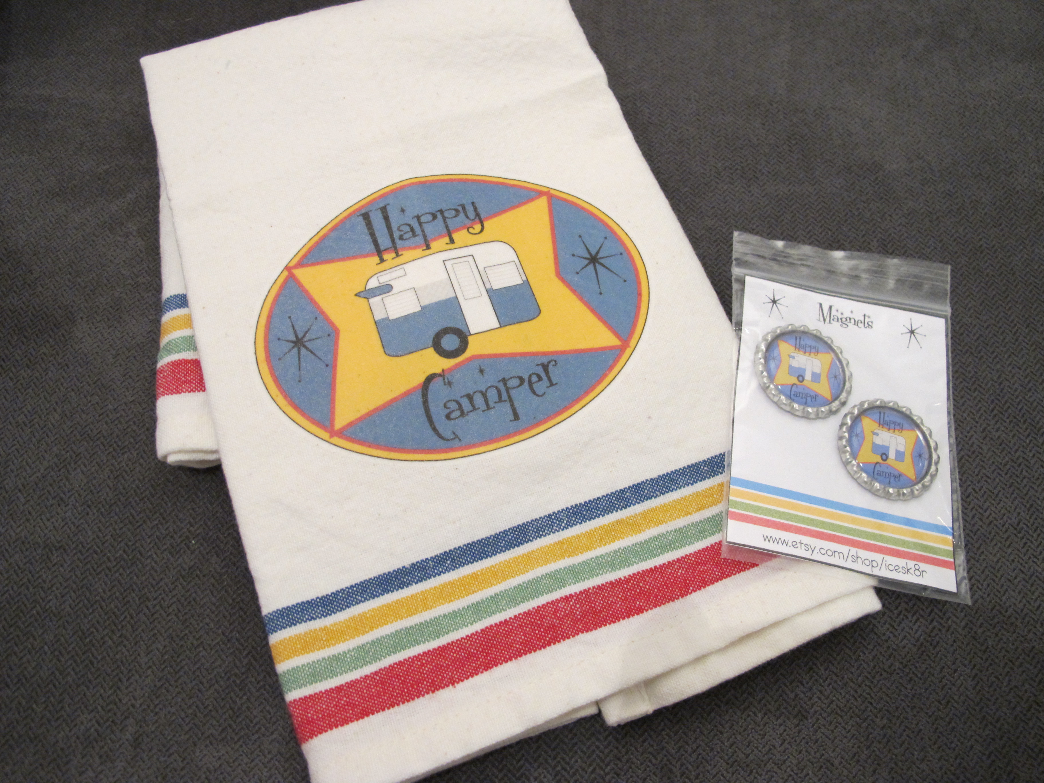 And as an added bonus, my Happy Camper dish towel and little magnets came in the mail today that I ordered from icesk8r at  www.etsy.com.