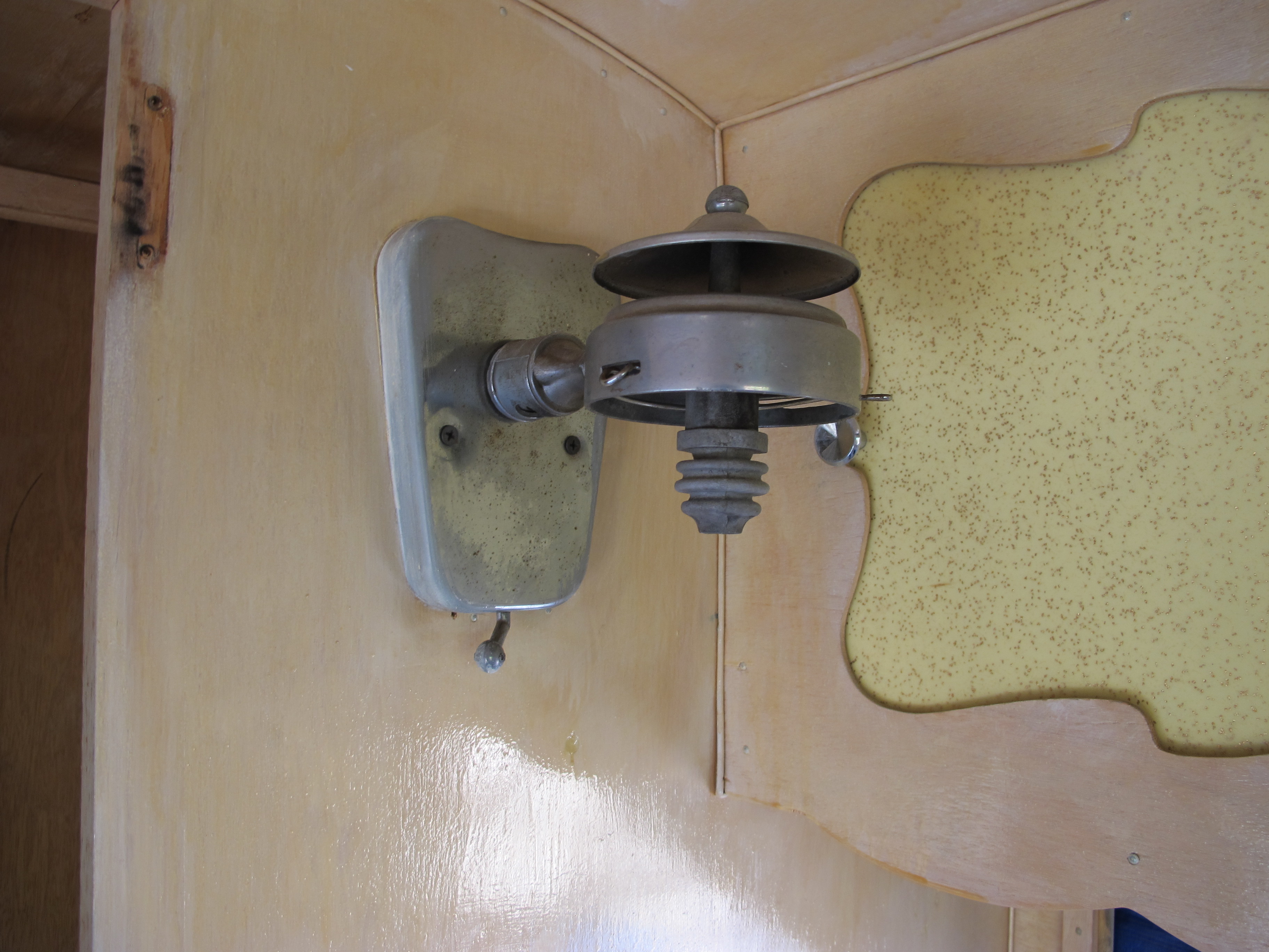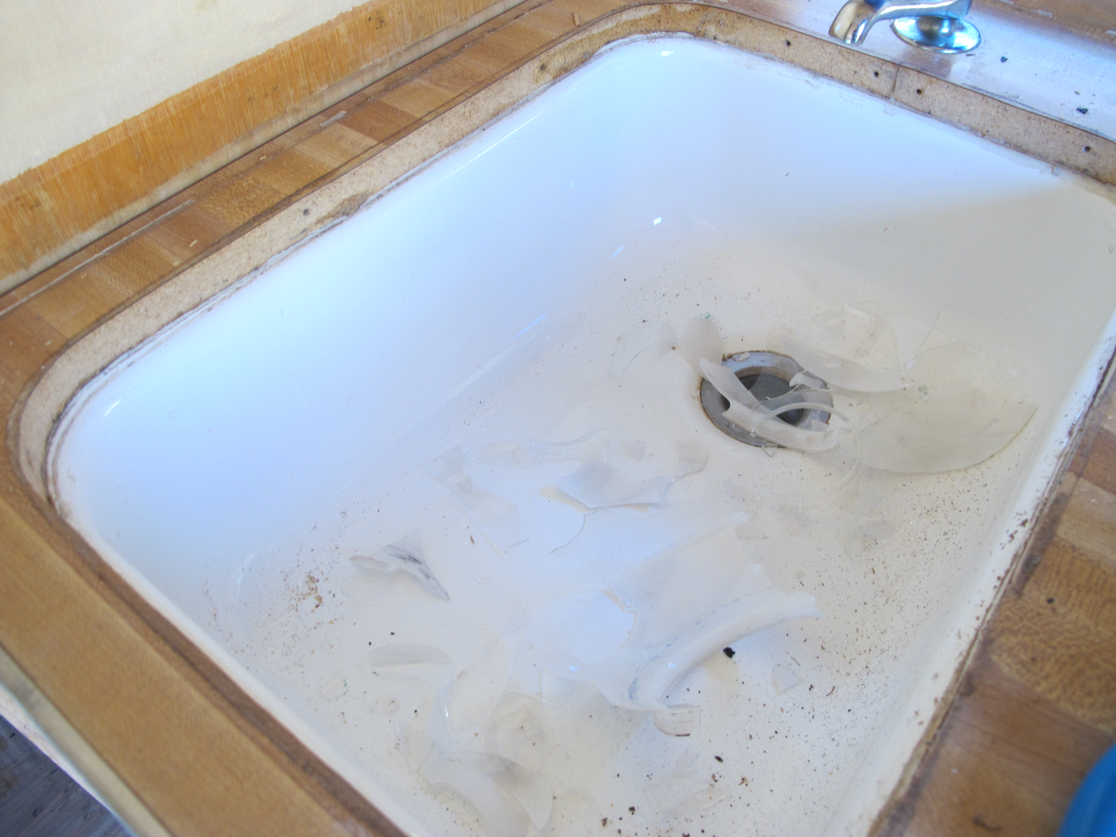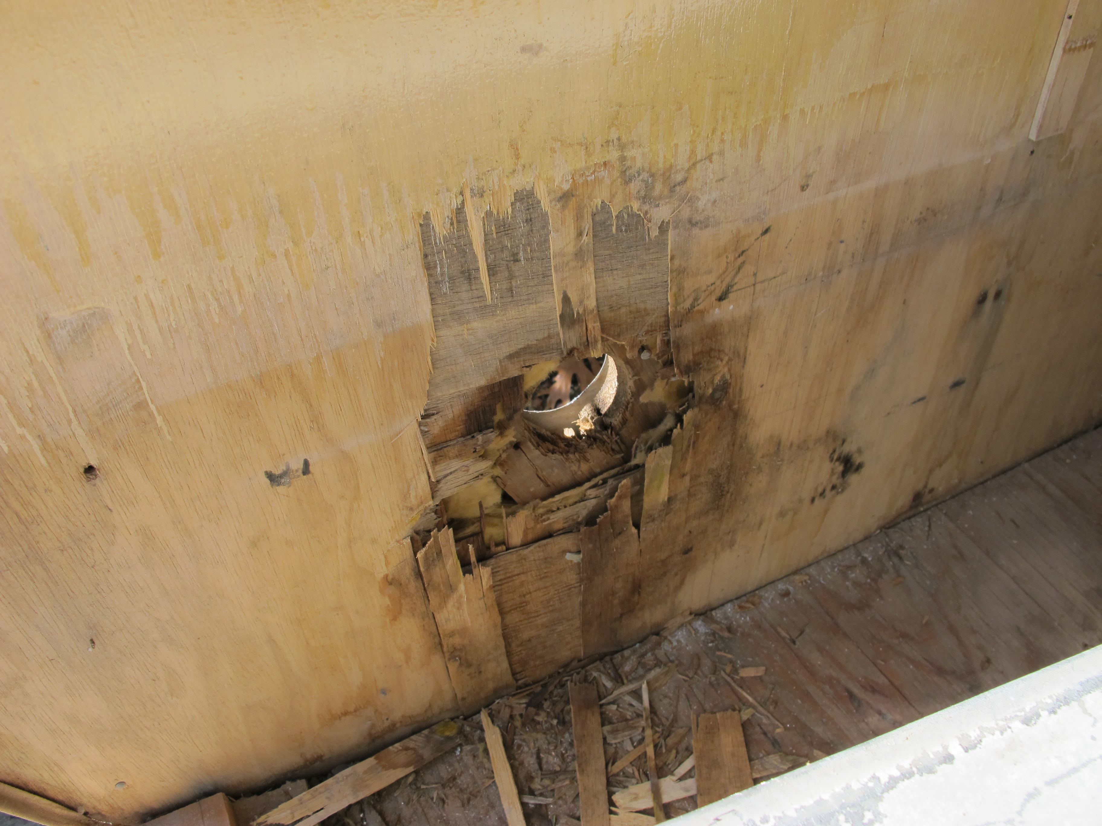 I cut a small hole in the paneling behind the sink so that I could get to the faucet and hand pump. I wasn’t ready to remove the paneling there yet since it’s helping to keep the structure sound for now.