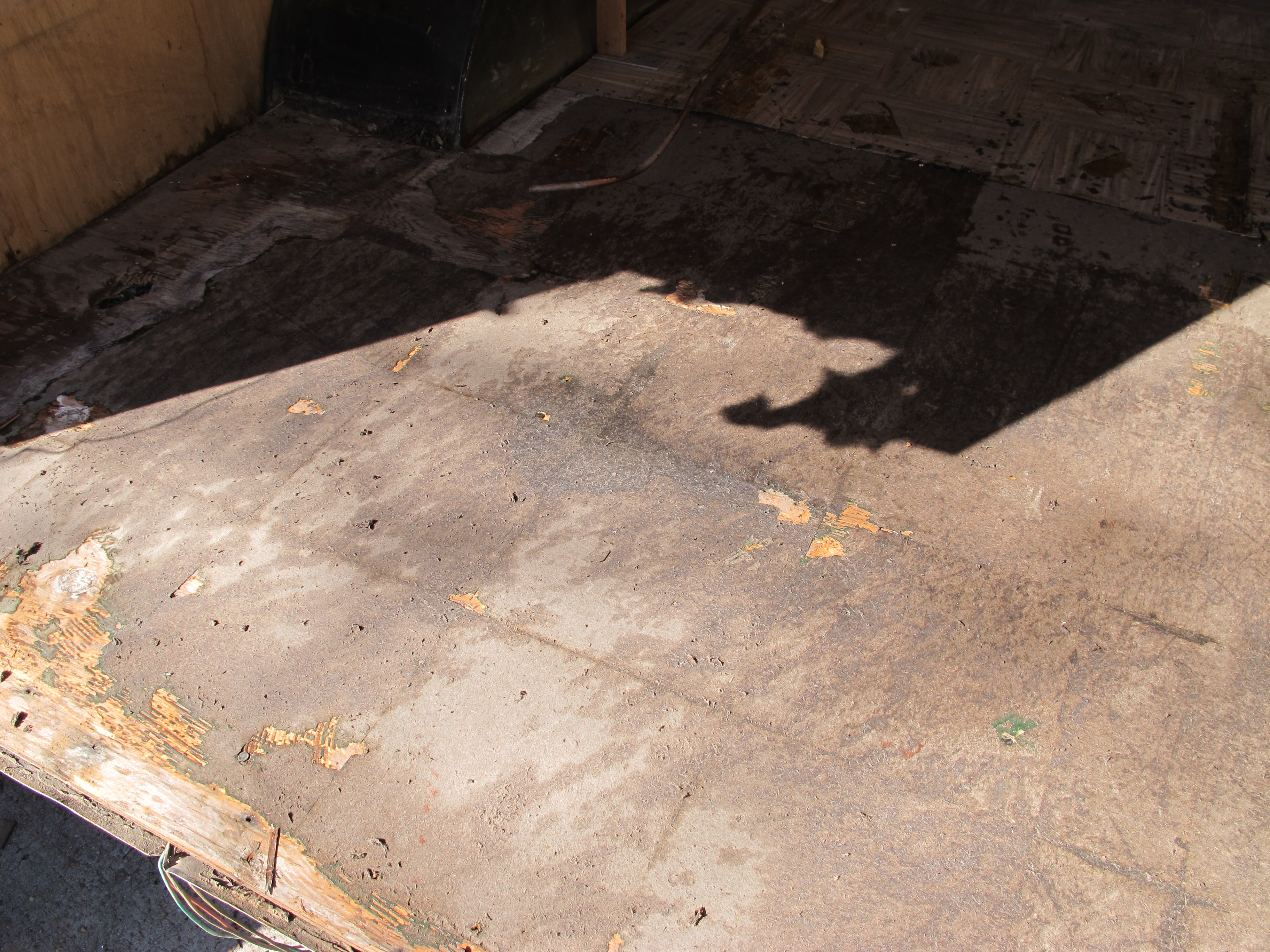 Next, I put on my goggles and face mask and proceeded to scrape off the tiles with a big tile remover. I kept wetting the tiles to ensure no particles were airborn. Unfortunately, the tiles are not coming off all the way and leaving behind the bottom part of the tile in most places. So frustrating! If there wasn’t asbestos in there, I wouldn’t care as much but since I’m almost 100% sure it’s there, I don’t want to just start cutting into the wood or something stupid. Once again, things are not going as easy as I would like. Figures!