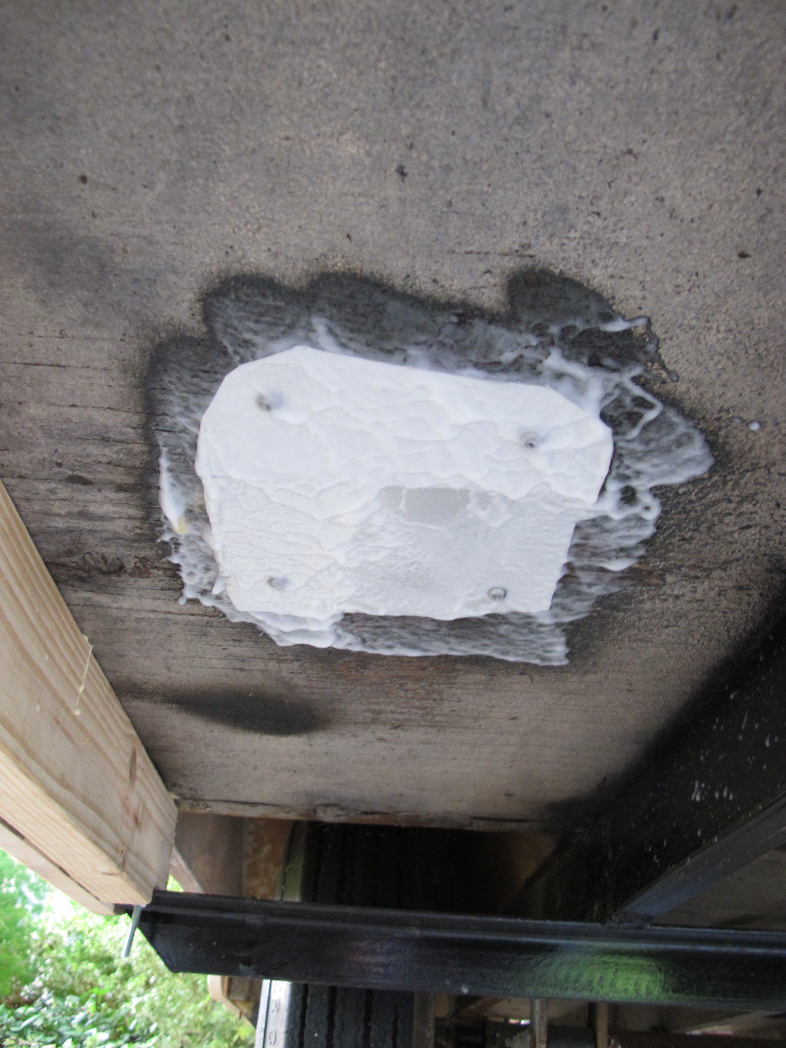 And here’s what it looks like after screwing the flashing on and spraying with a bunch of rubber sealant. I will also be painting the undercarriage later to make sure it’s all waterproof.
