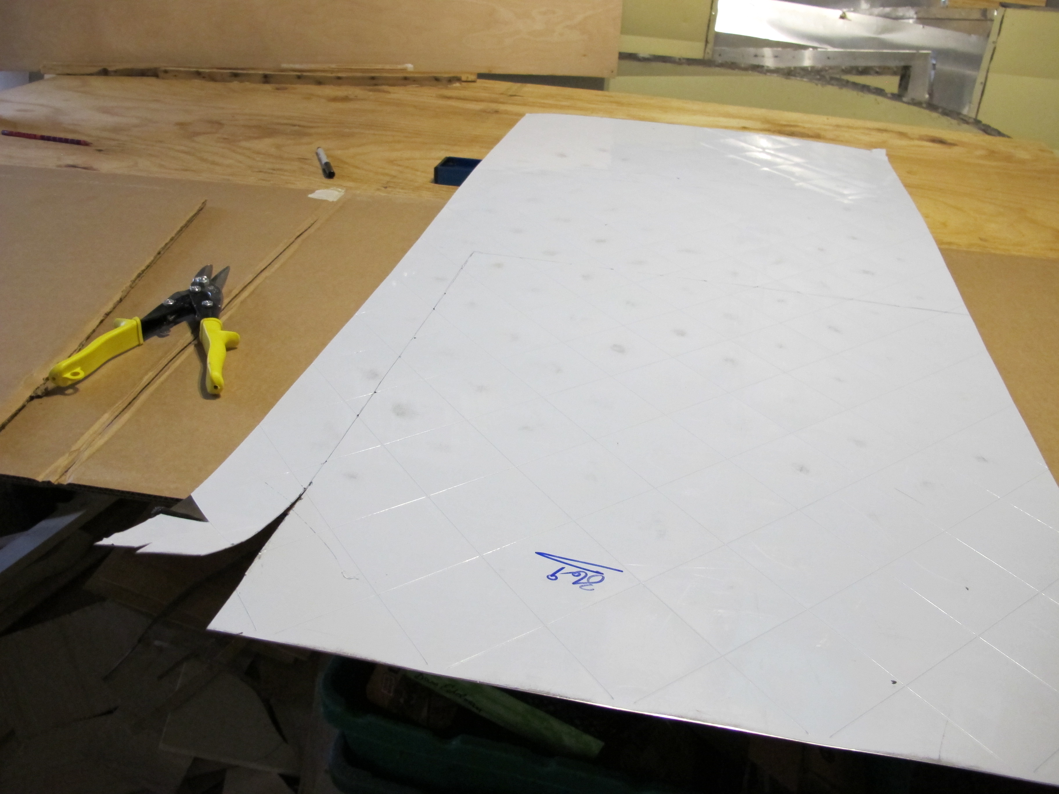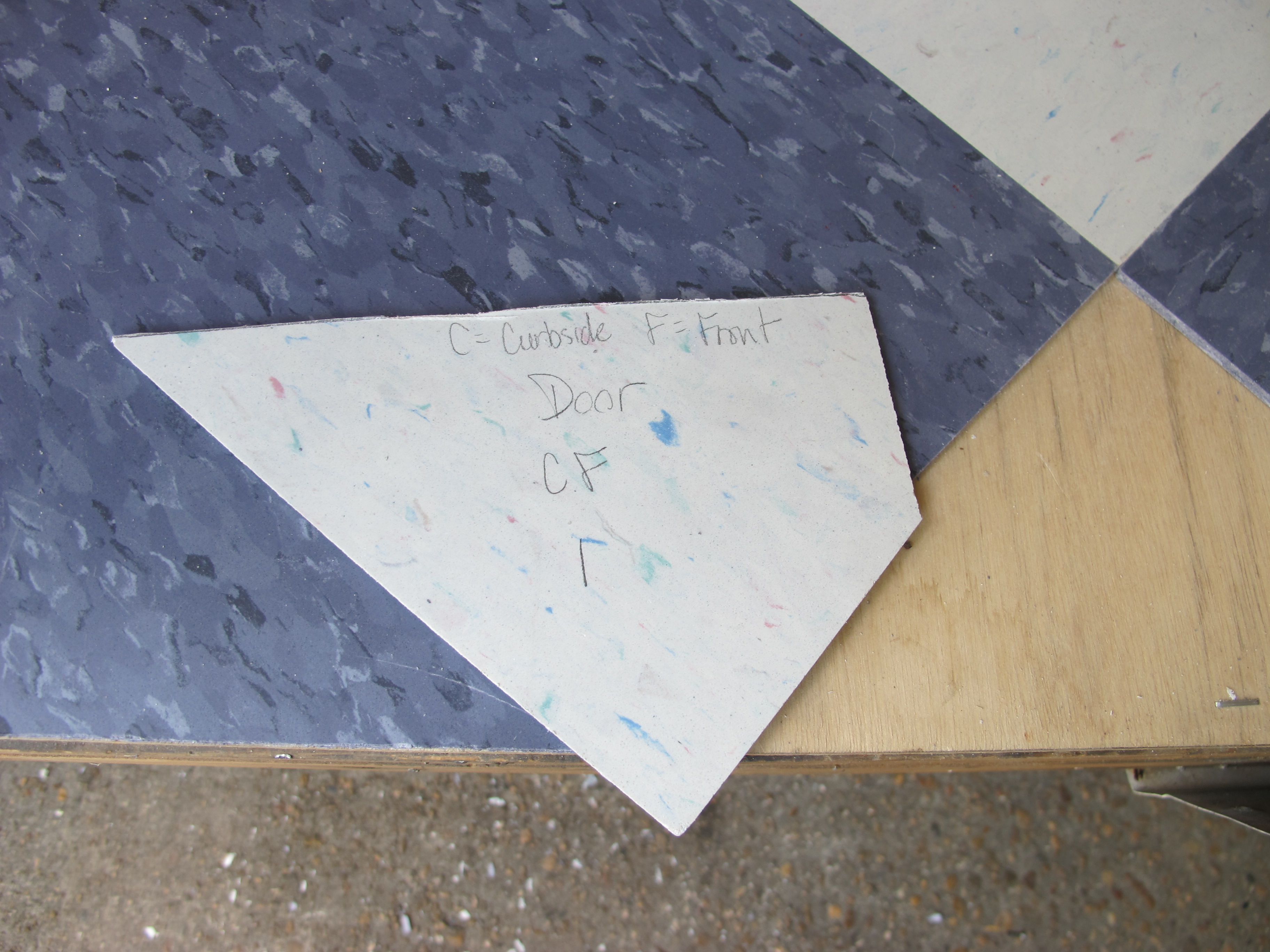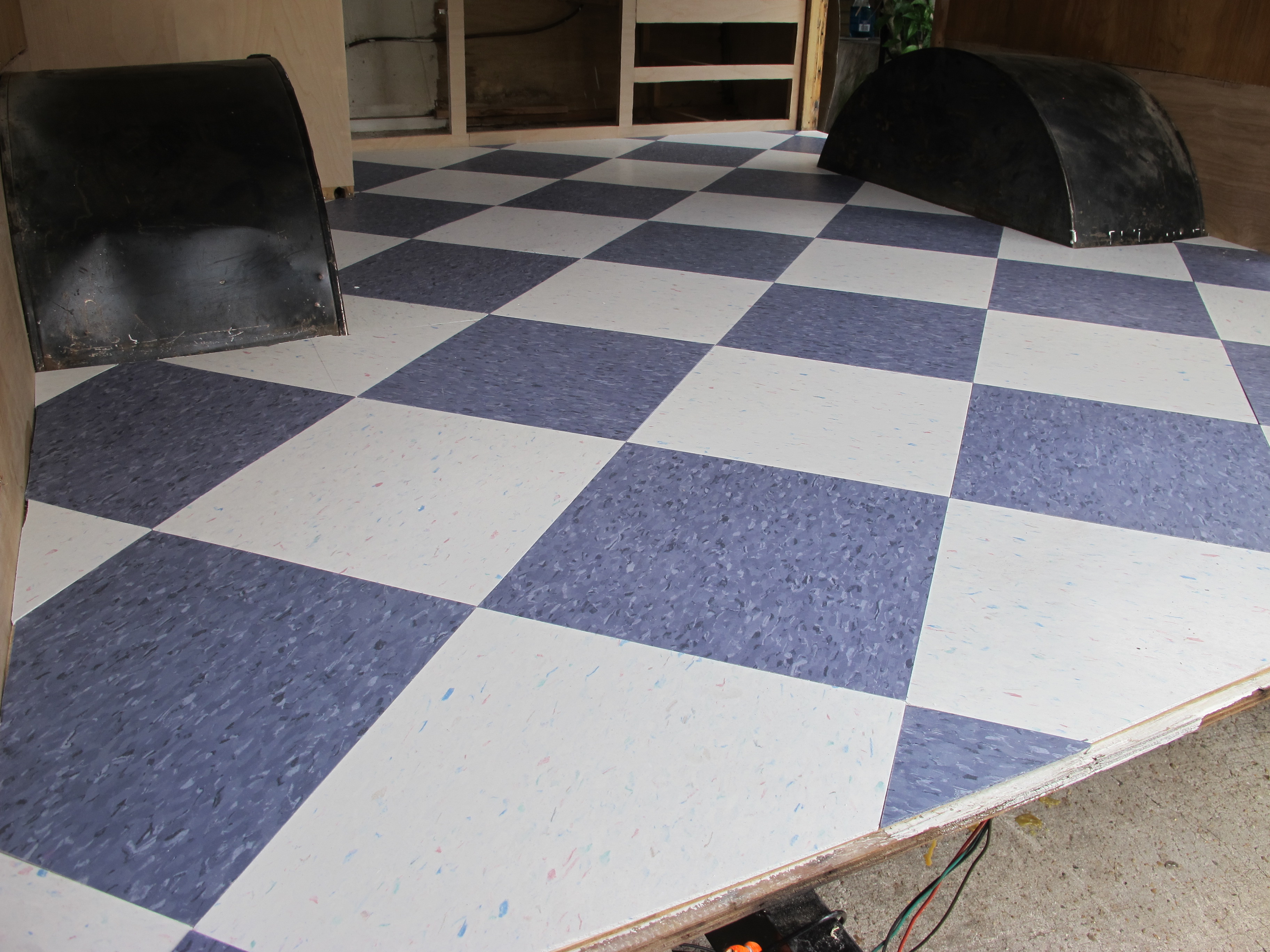 After that, I decided I really wanted to get all of my tiles laid out and cut to size.  I followed the instructions that Larry shared on his website, http://www.cannedhamtrailers.com/, and it worked perfectly!  I chose purple and white vinyl tiles since my theme is centered around purple. smile
