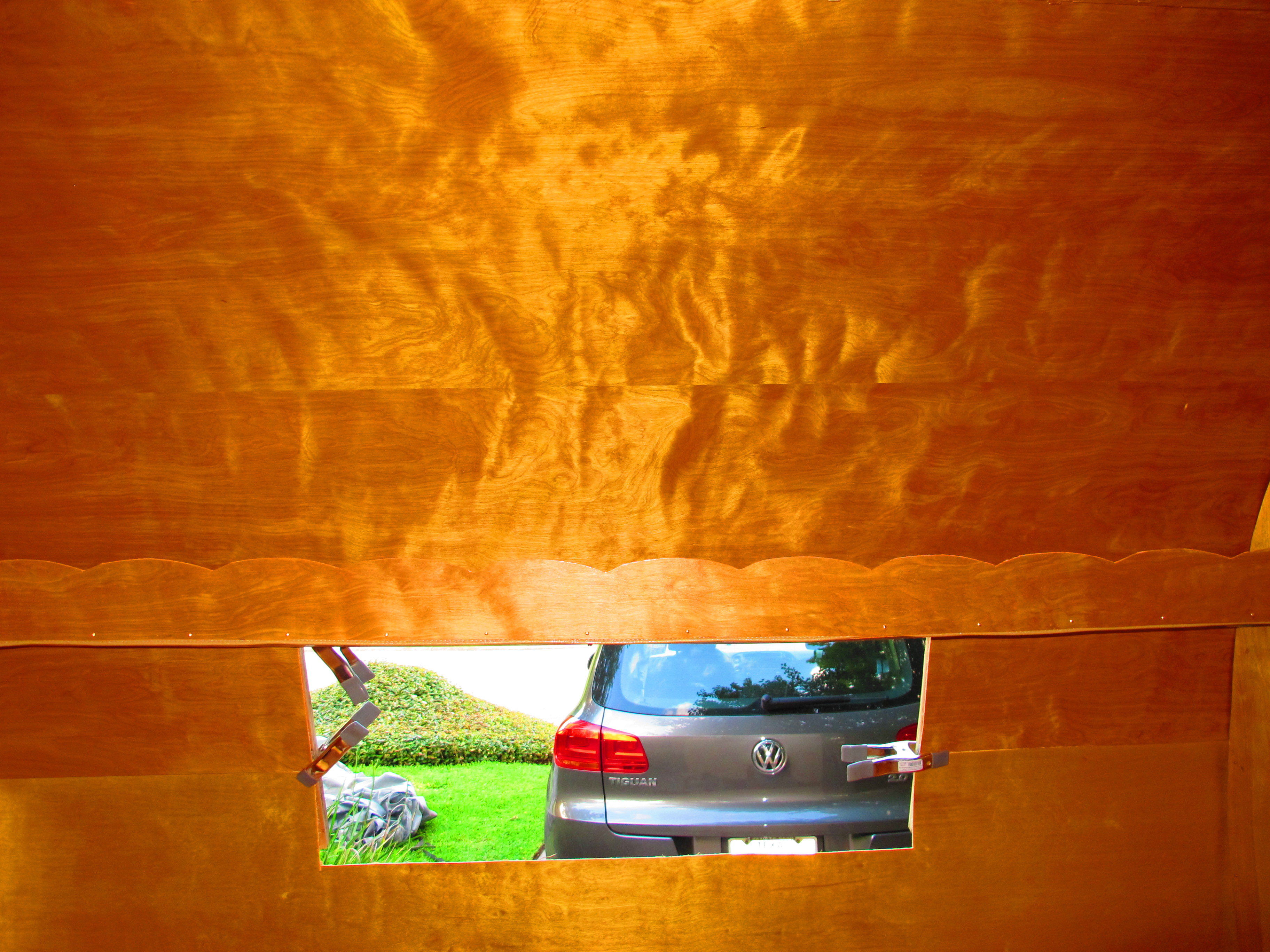 A couple of weeks ago, I started replacing the ceiling panels in Junebug. I had already spent countless hours shellacking them to perfection, and wouldn’t you know, I accidentally cut the one that goes over the kitchenette the wrong size and had to scrap that piece. ugh It was getting late in the day, so I went ahead and put the tarp, then the waterproof cover over Junebug and went inside to make myself something to eat for dinner. The next day, Memorial Day, Houston had a torrential downpour. I stayed inside all day and cleaned house and watched movies. It was a nice, relaxing way to spend my Memorial Day. On Tuesday, I got up and got ready to go to work. As I was walking out the front door (it was still raining, fyi), I noticed that Junebug’s cover was pulled up a bit in the front. My mind immediately thought of the open hole in the ceiling where the panel was still missing. I didn’t even think to put any support there because I had no idea we were going to get so much rain! I ran to get the ladder to look at the roof and assess the damage. It was WORSE than expected. The tarp over the hole had sunken in and there was about enough water collected in it to fill a bathtub! I squeezed my way under the tarp to get inside the camper to see if I could lift up the tarp from the inside and make the water come out. That was pointless, it was way too heavy.