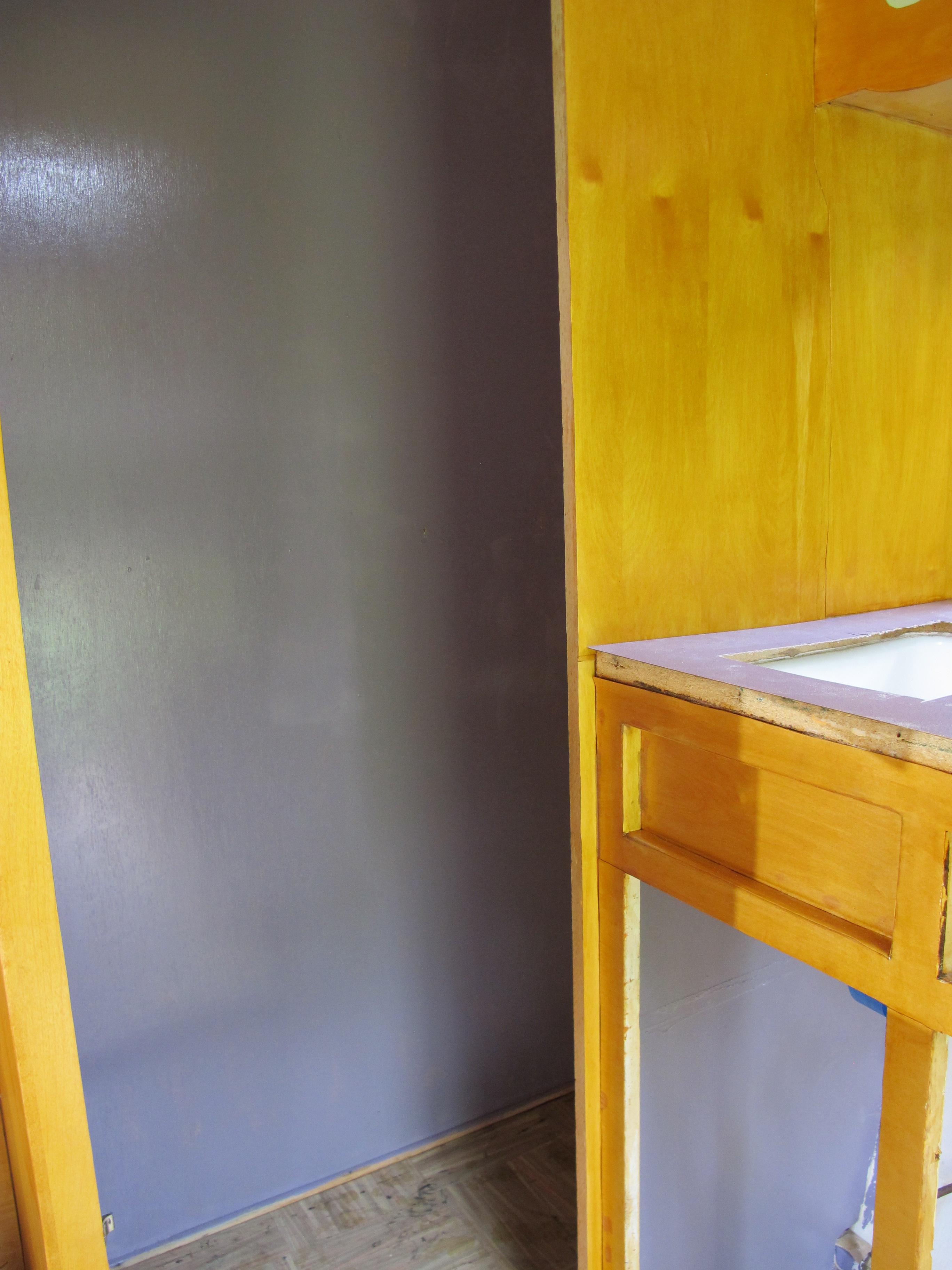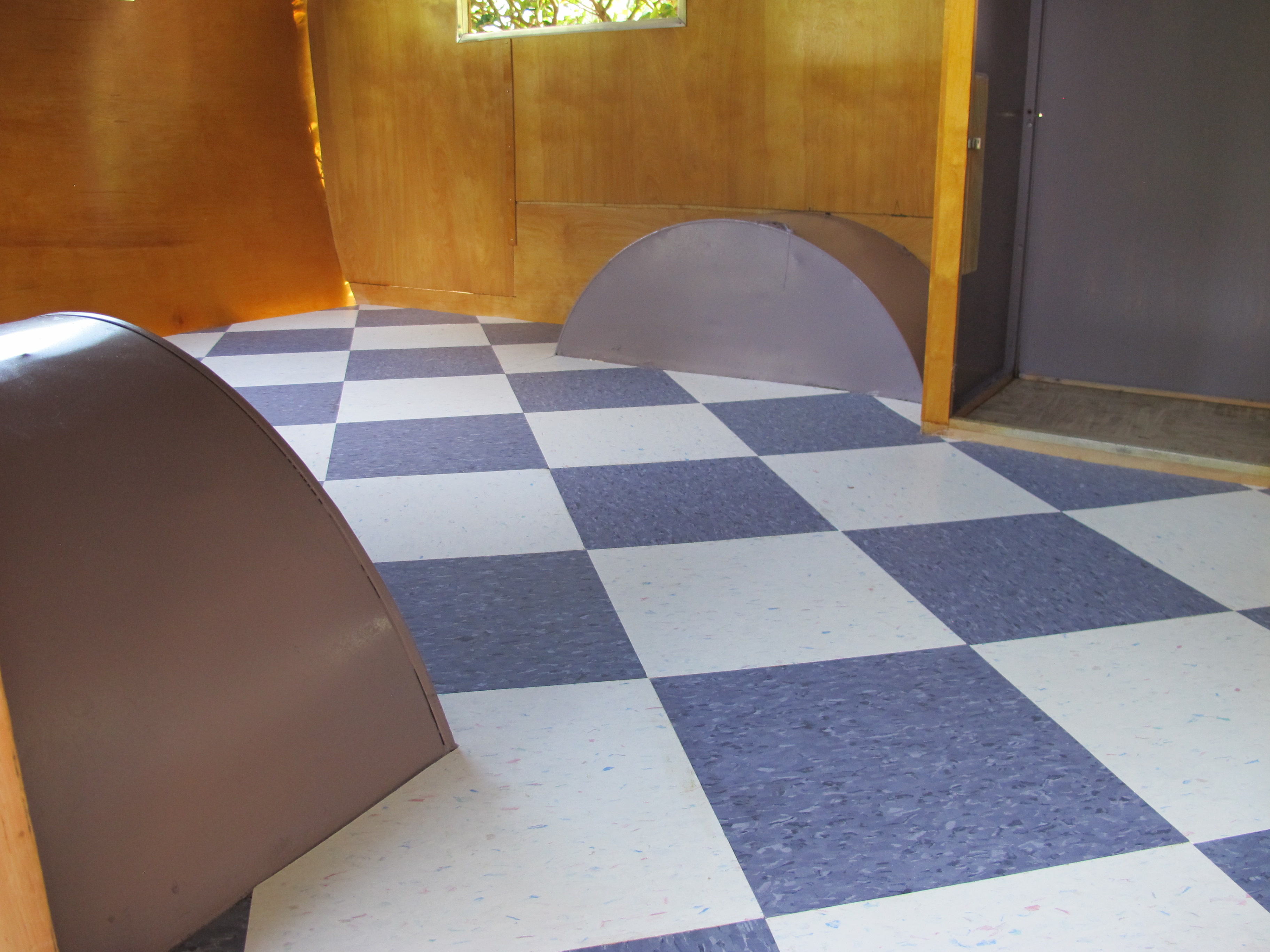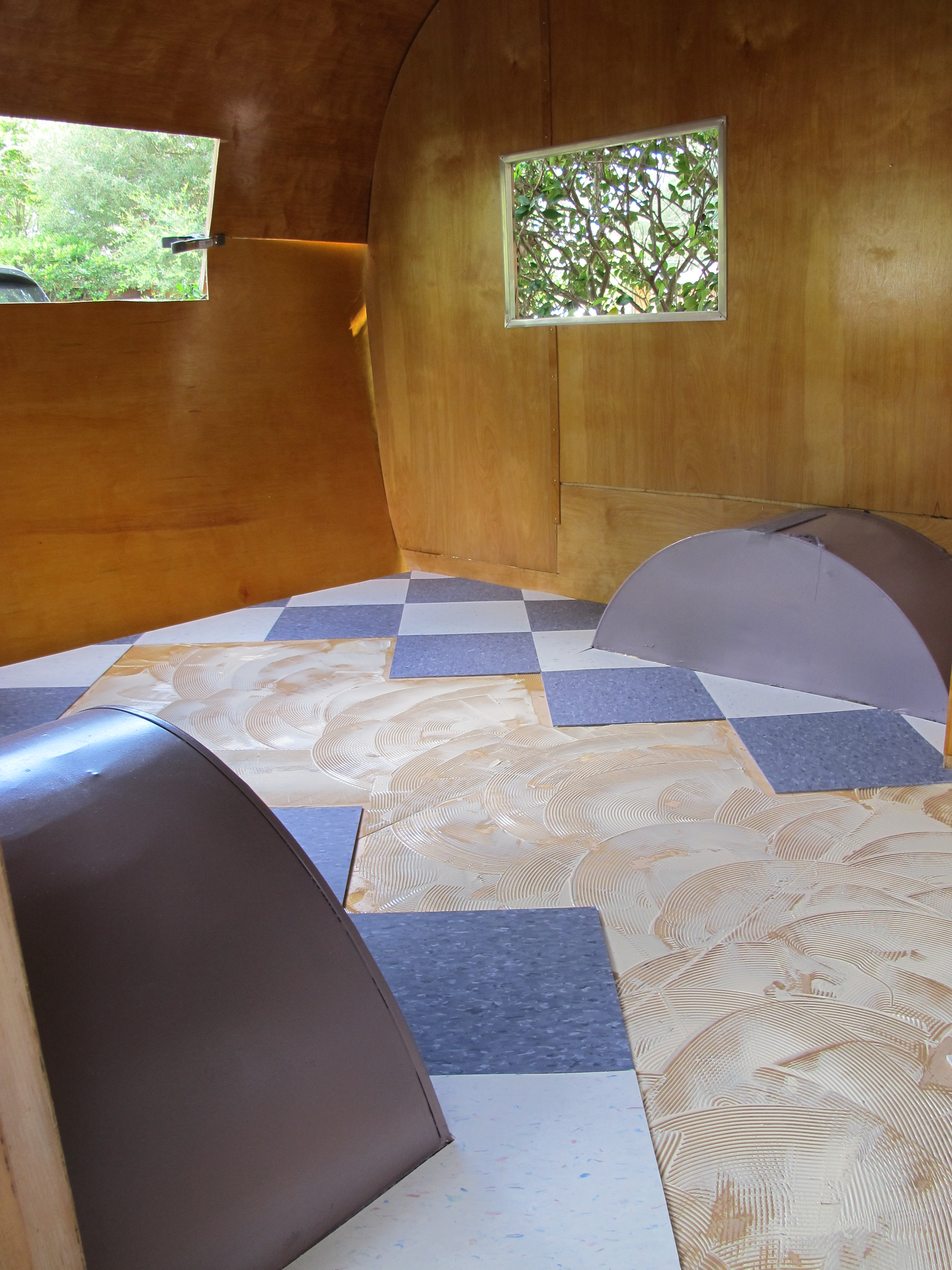 I thought it was going to rain today, but I lucked out and it was nice and sunny all day.  I was able to lay the tile today as well as continue repairing some of the exterior framing.  I also had fun painting the wheel wells and part of the closet purple, my favorite color!  I think I’m going to use the same shade for the lower half of the exterior of Junebug later down the road.