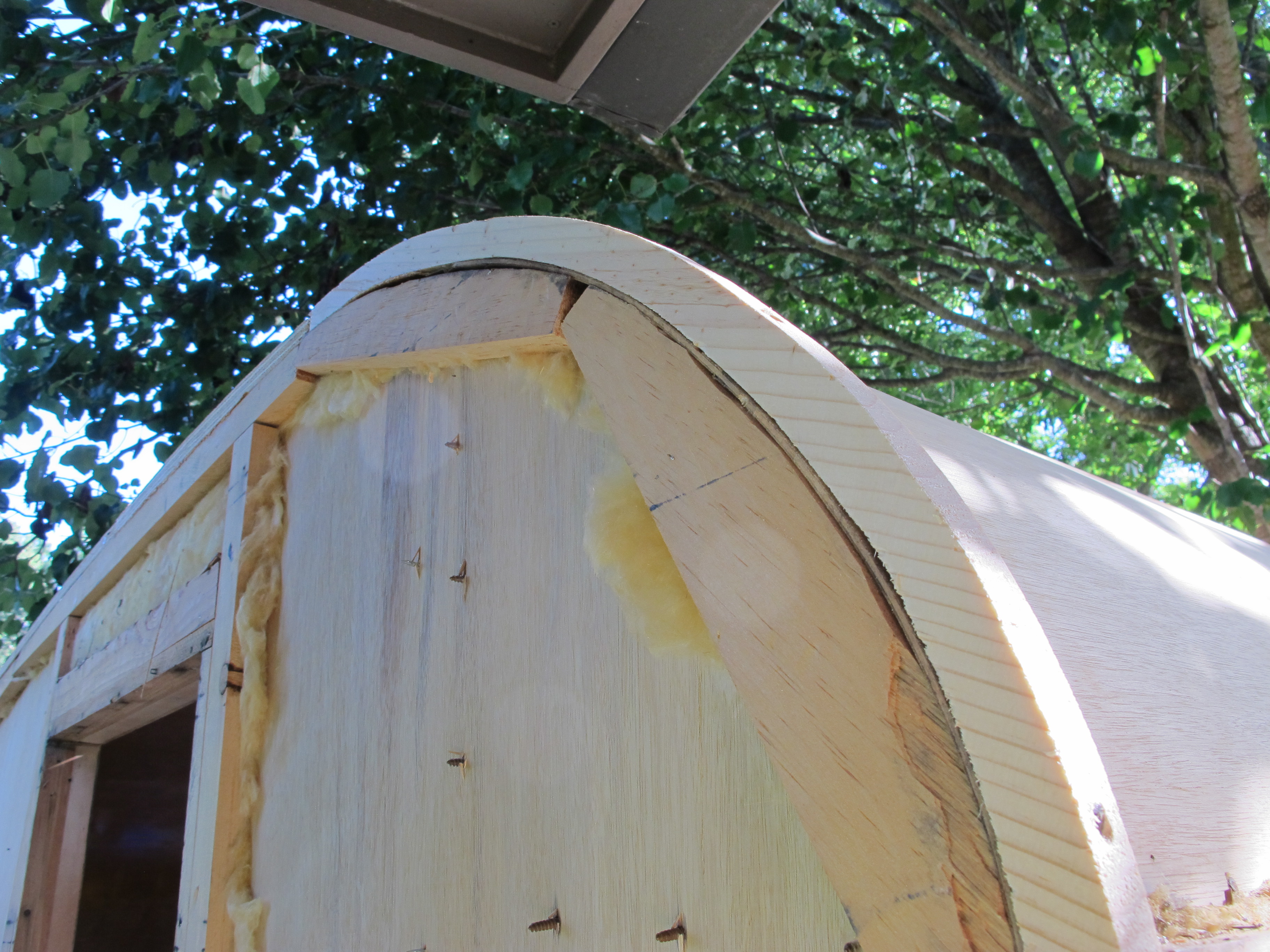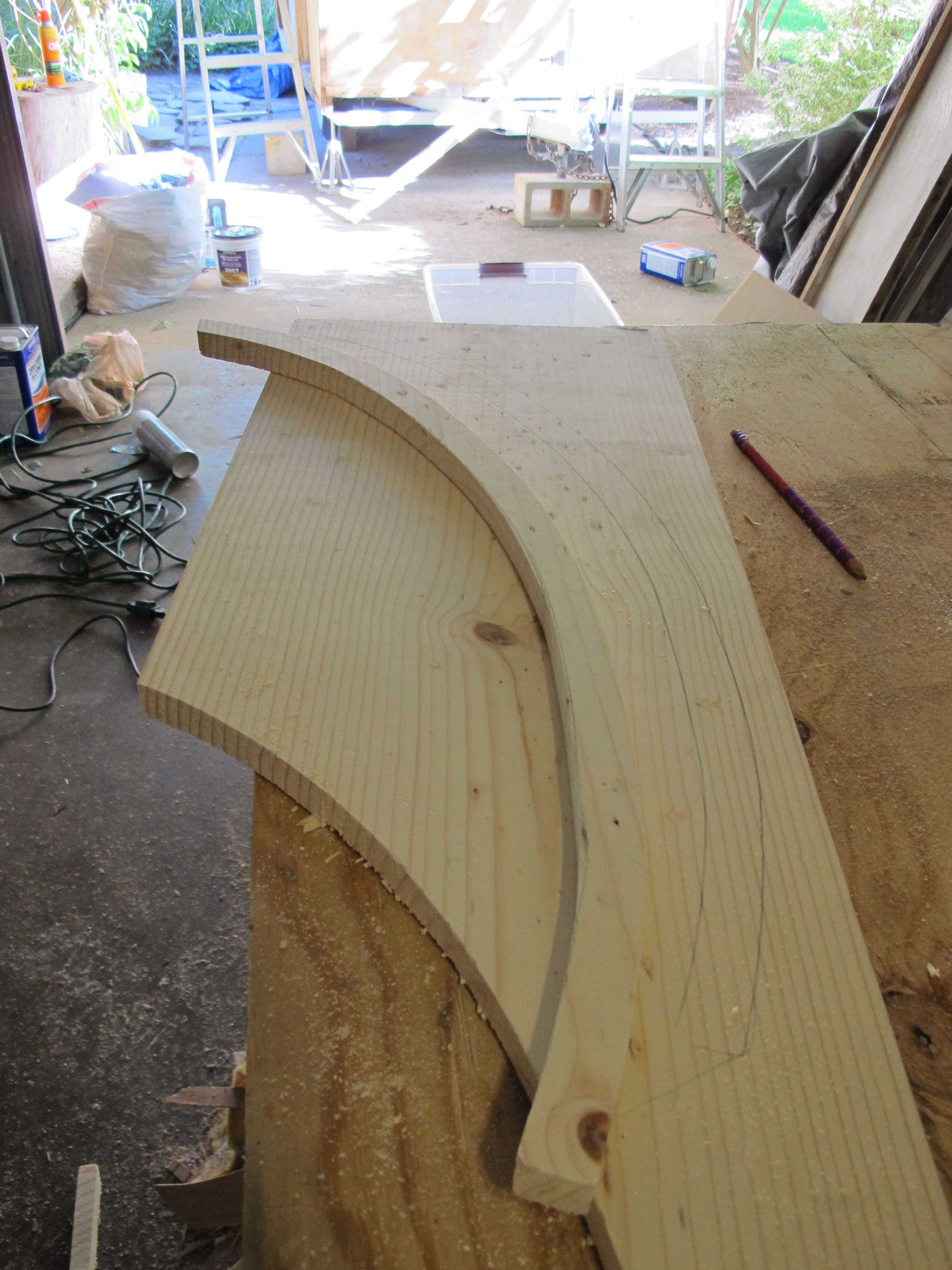 My last task of the day was to cut some curved pieces of wood to replace the rotted plywood around the edges of the roof frame.