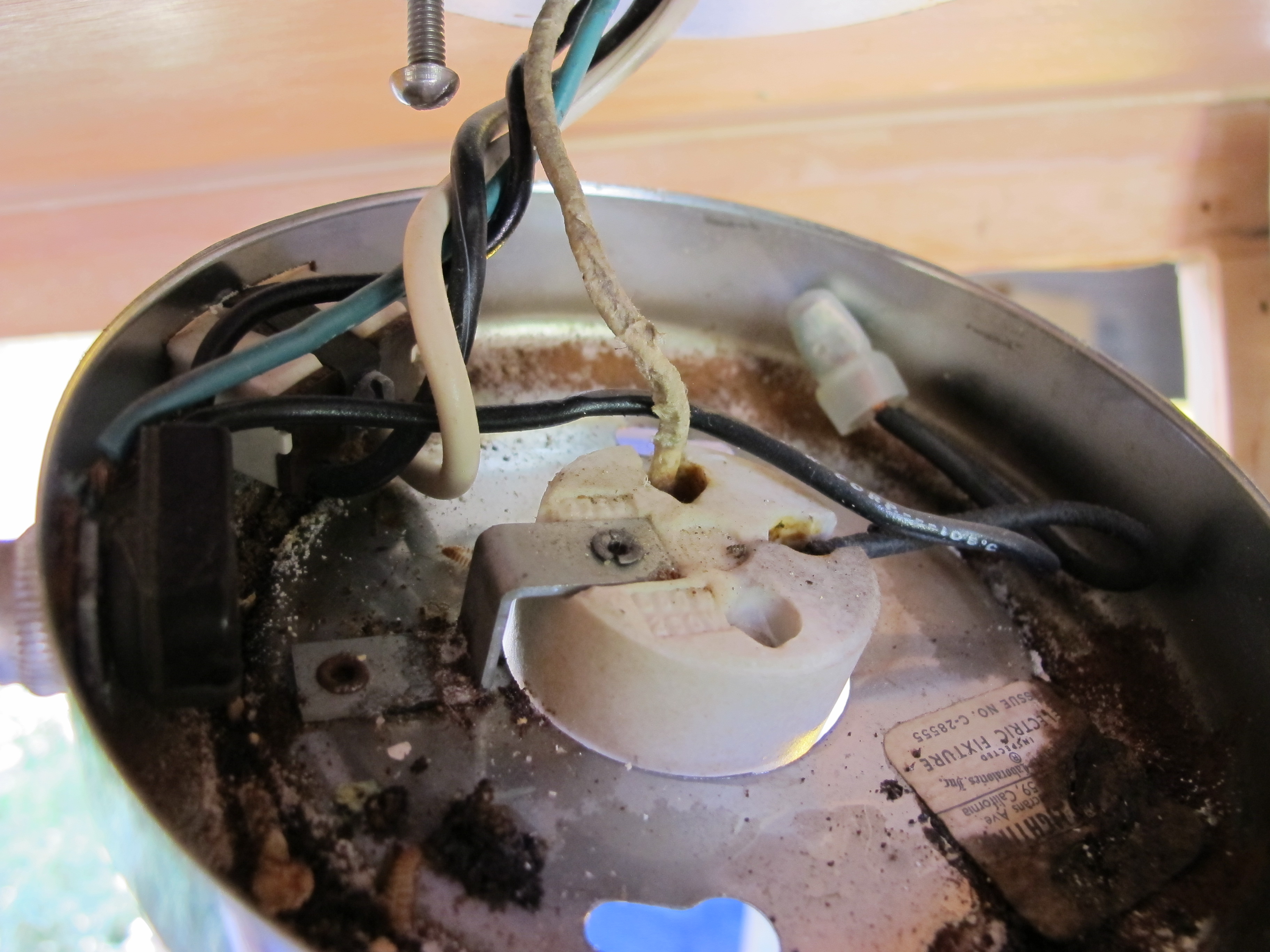 Here’s what the kitchen fixture looked like when I took it apart today.  It’s kind of rusty and the wires don’t look too great.  I might try to replace the wires attached to the fixture if I can. I will also clean up all of the rust inside before I reinstall it.