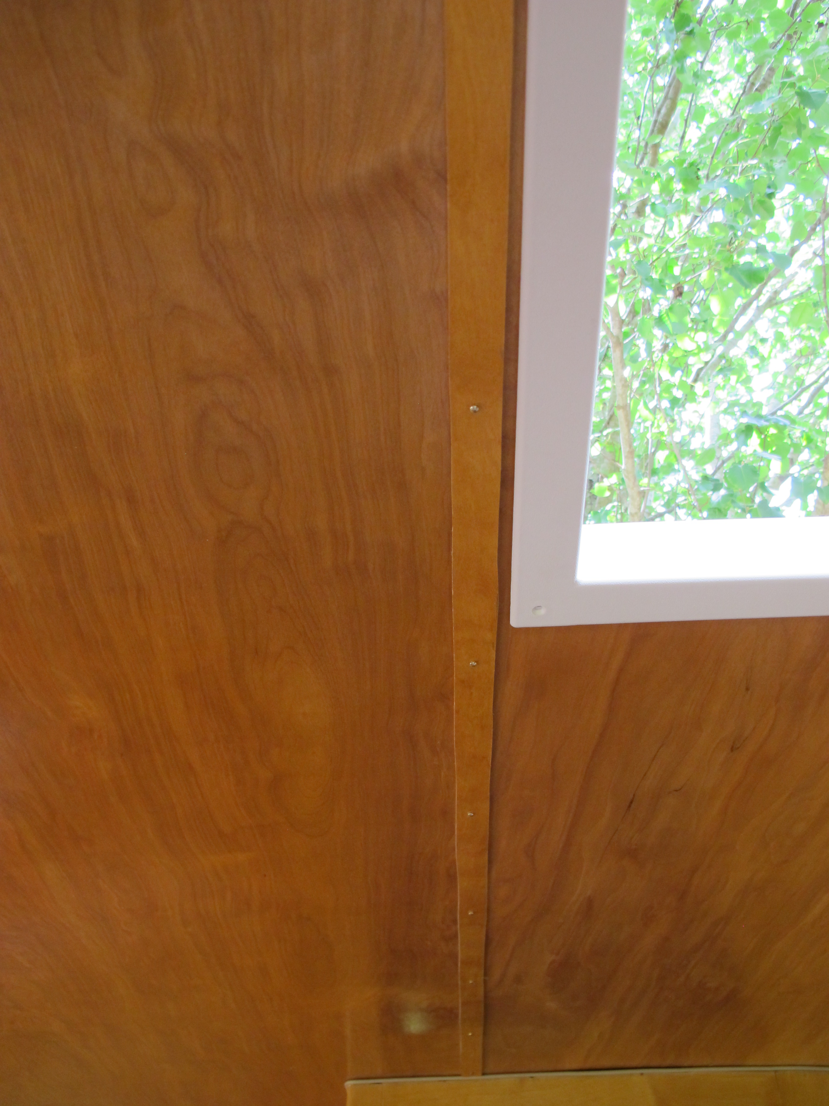 It was a pain in the butt drilling holes in all of the support beams in order to thread my electrical wires through all of them.  My arms got so tired and I was worried the whole time that I would accidentally drill a hole through my ceiling panel.  Luckily that did not happen.  Once I started drilling the holes, I realized that I might poke a twist nail into the hole and puncture one of my wires when I installed the trim inside the camper, so I decided I had better install all of the trim first, then finish with the wiring.