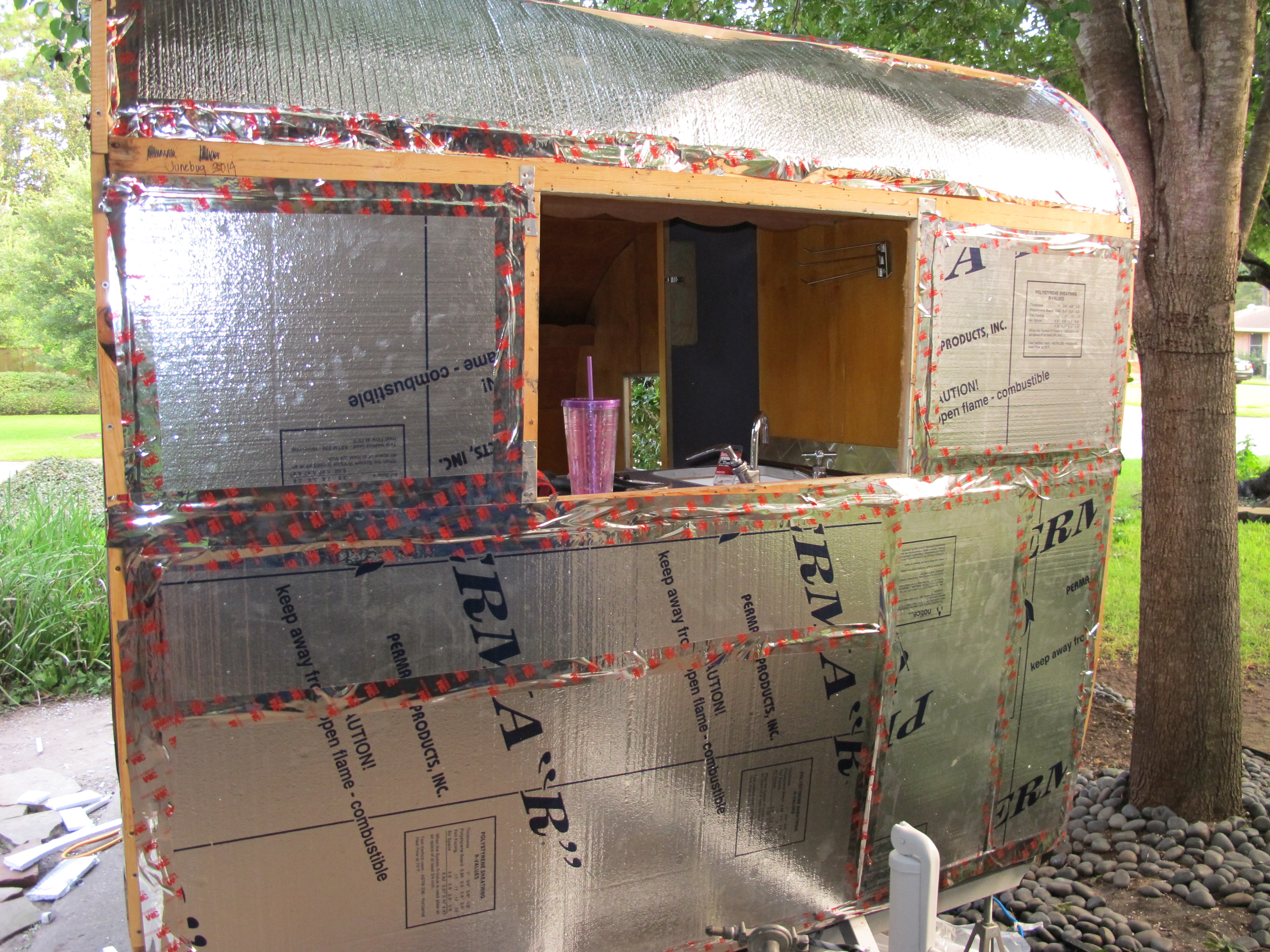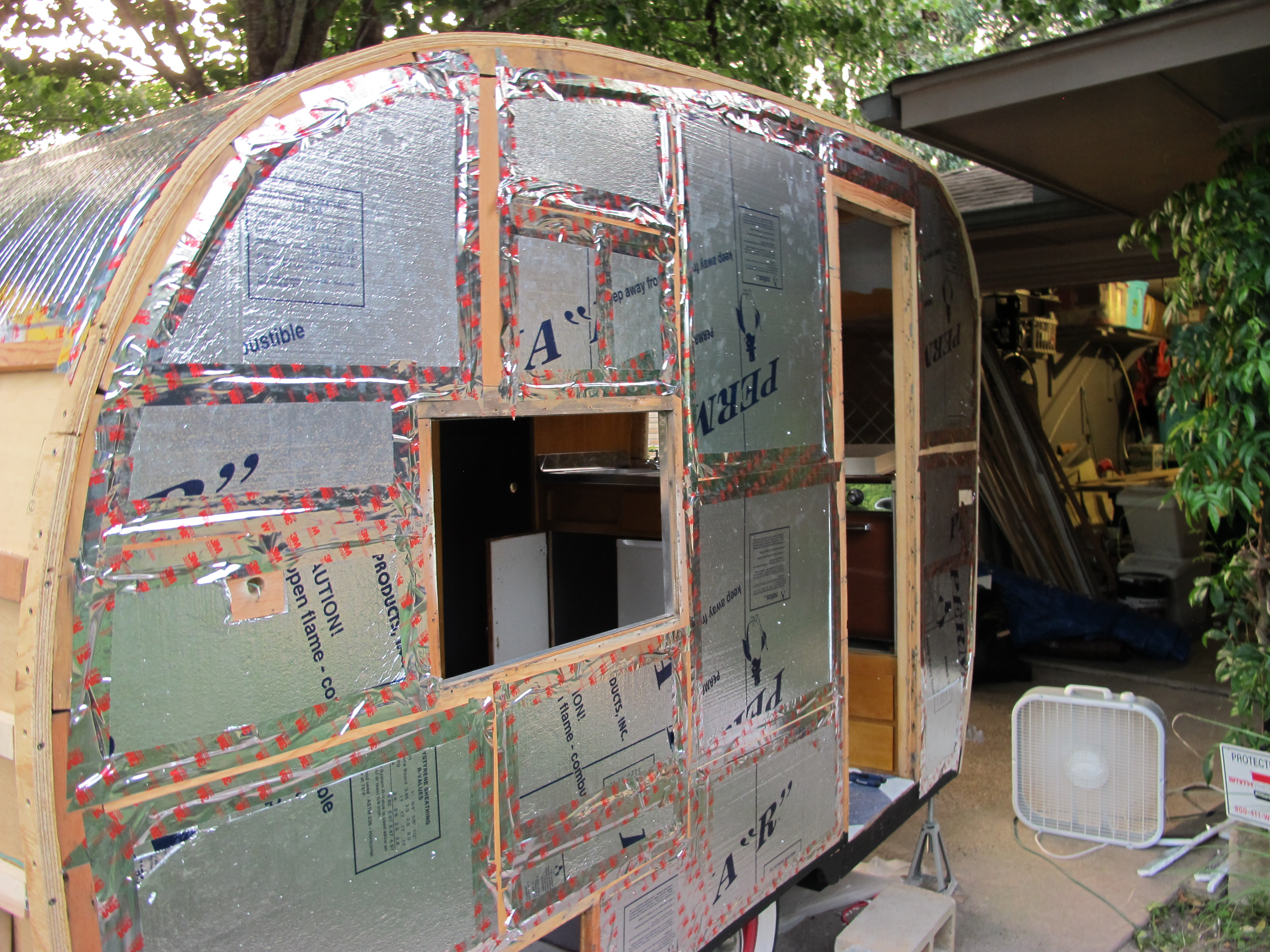 This task took me most of the day.  The last thing I accomplished today was to install most of the insulation.  It wasn’t that difficult to do, but it was time consuming, and also a bit frustrating where there were wires because the rigid foam insulation wouldn’t lay down flat.  I also bought Reflectix bubble insulation for the really curvy parts of the roof.  Glad I did, they were much easier to install thanks to the flexibility of the material.  I just have the street side and part of the rear to complete tomorrow and then the skin can go on!  IMG_4715IMG_4716