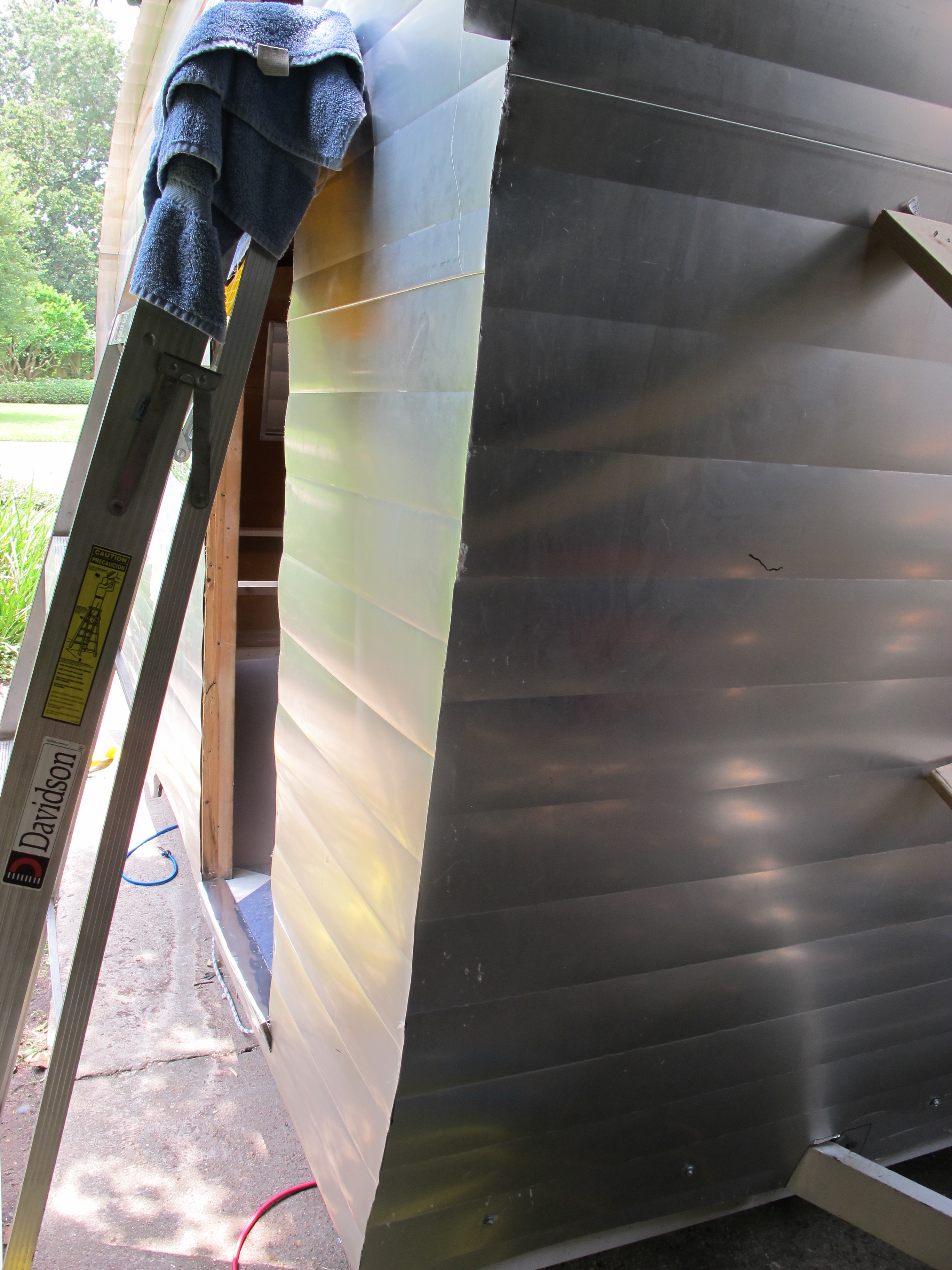 Unfortunately, I ran into another buckling problem, right at the end! You can see where the buckling occurred, right next to the steel beam. I also cut the holes in the skin in the wrong spot and had to make them much wider, thanks to my initial buckling problem. So… Junebug is going to be far from perfect at the end of this. But I’m not perfect either. I mean, who wants to be perfect? That’s so boring. hahaha