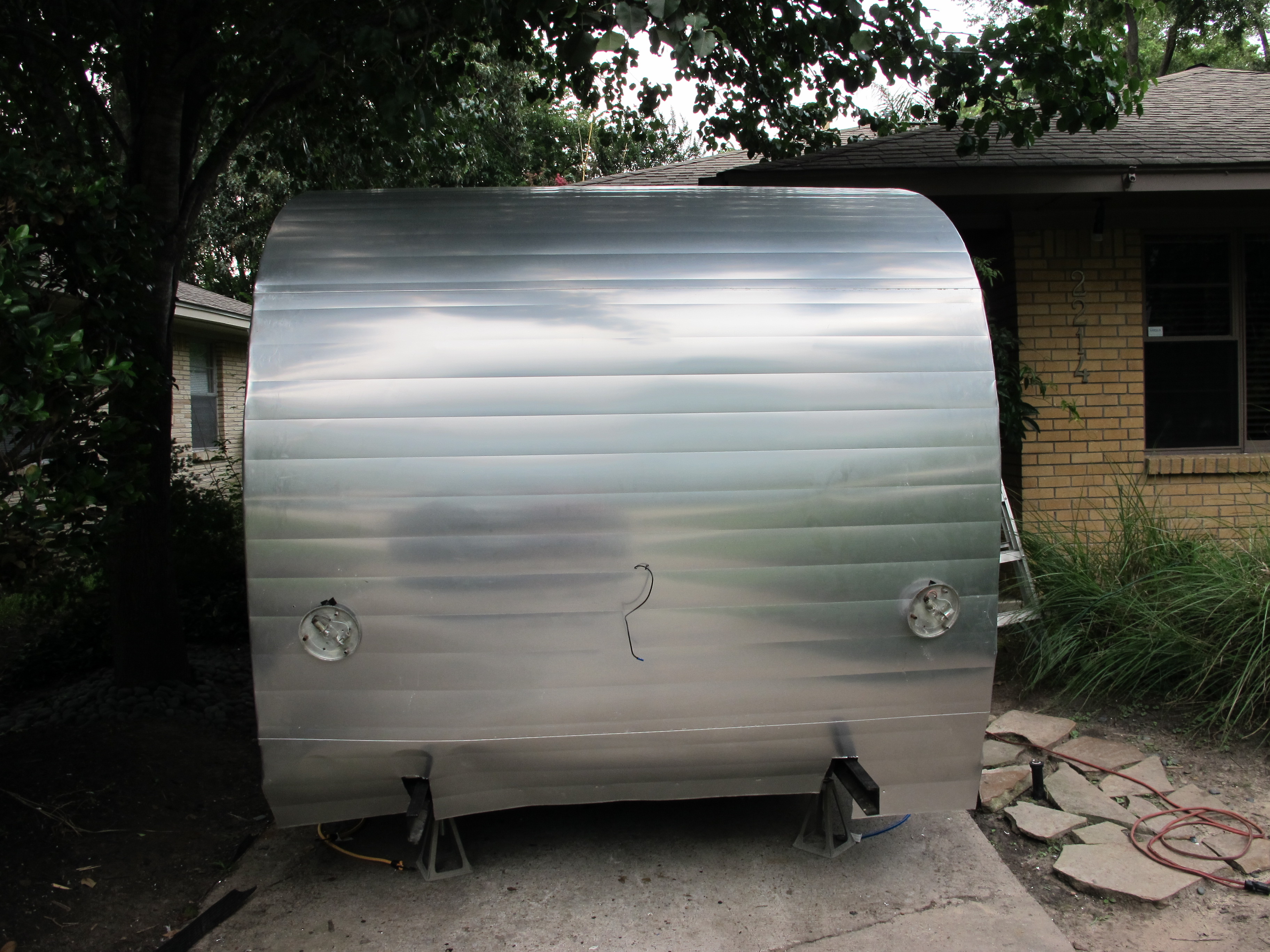 And here’s a shot of the whole thing after two hard days of labor. I still need to finish the very bottom of the rear, but it’s almost there! I also need to finish cutting out the window holes and add the drip rail and trim.