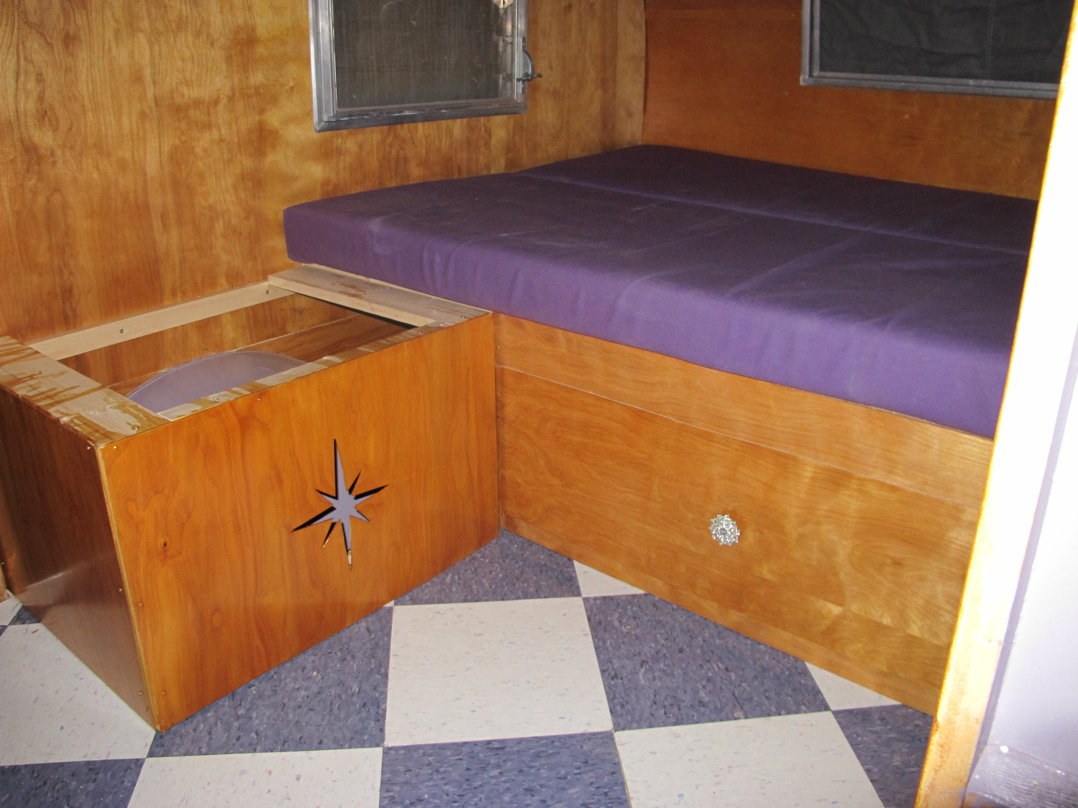 And after applying 3 coats of amber and 3 coats of clear shellac, they’re all done! Now, I just need to finish making the cushions for the tops and secure the benches to the floor. I laid down on the bed today to see what it felt like and it was pretty comfortable! I can’t wait to spend the night in Junebug again!