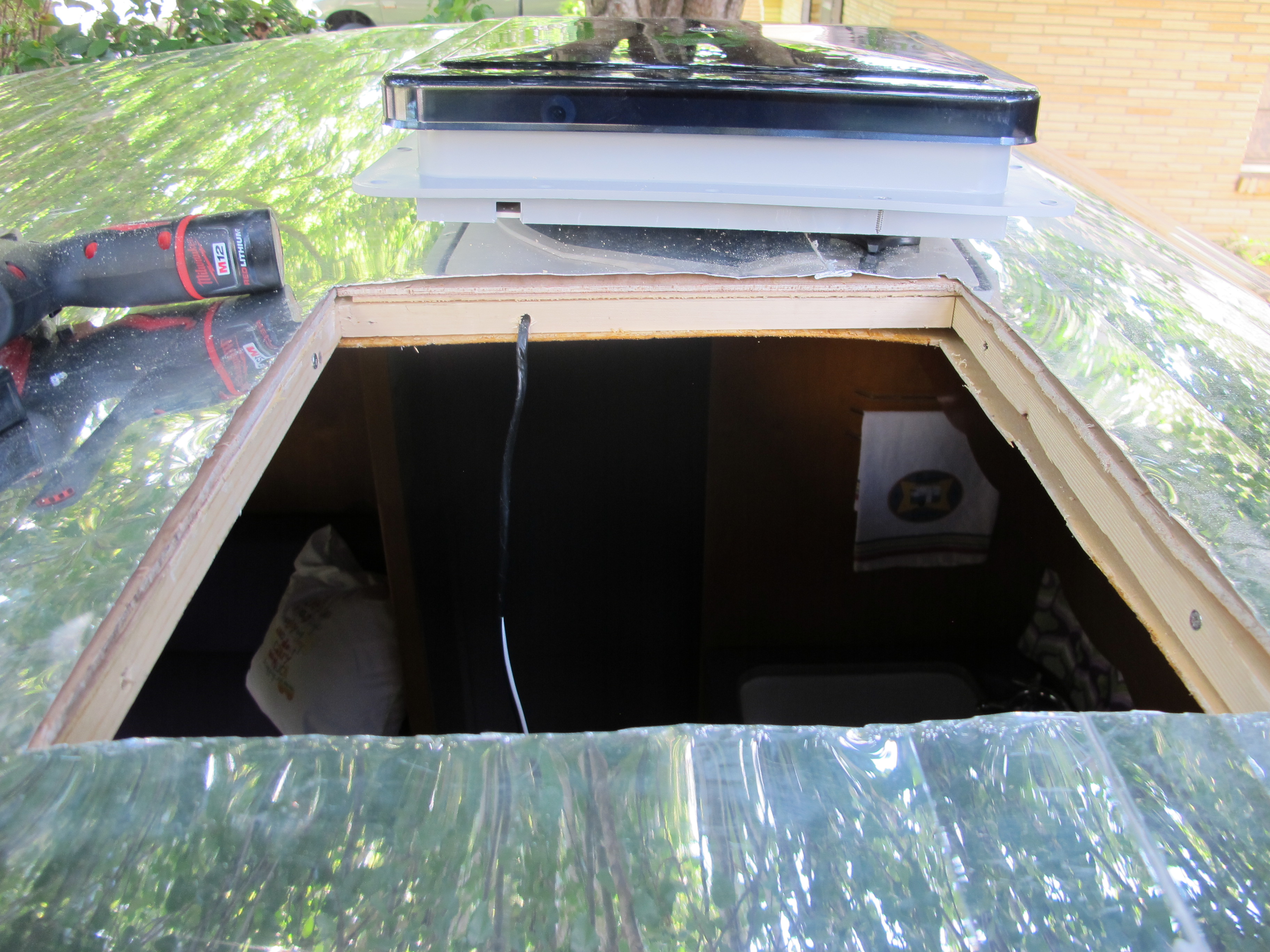 Next, I set out to install my new Fantastic Vent.  It proved to be a difficult task (what a surprise), because I had inserted some additional framing pieces underneath the skin to make it sit a little higher (to help the water run off) and they were making the hole too small for the vent.  I couldn’t just take them out because they were all attached to make a square.  So…I had to get out my oscillating tool and saw away at the sides until I got it to be big enough for the fan to fit inside.  It took a while, but at least I finally got it installed!