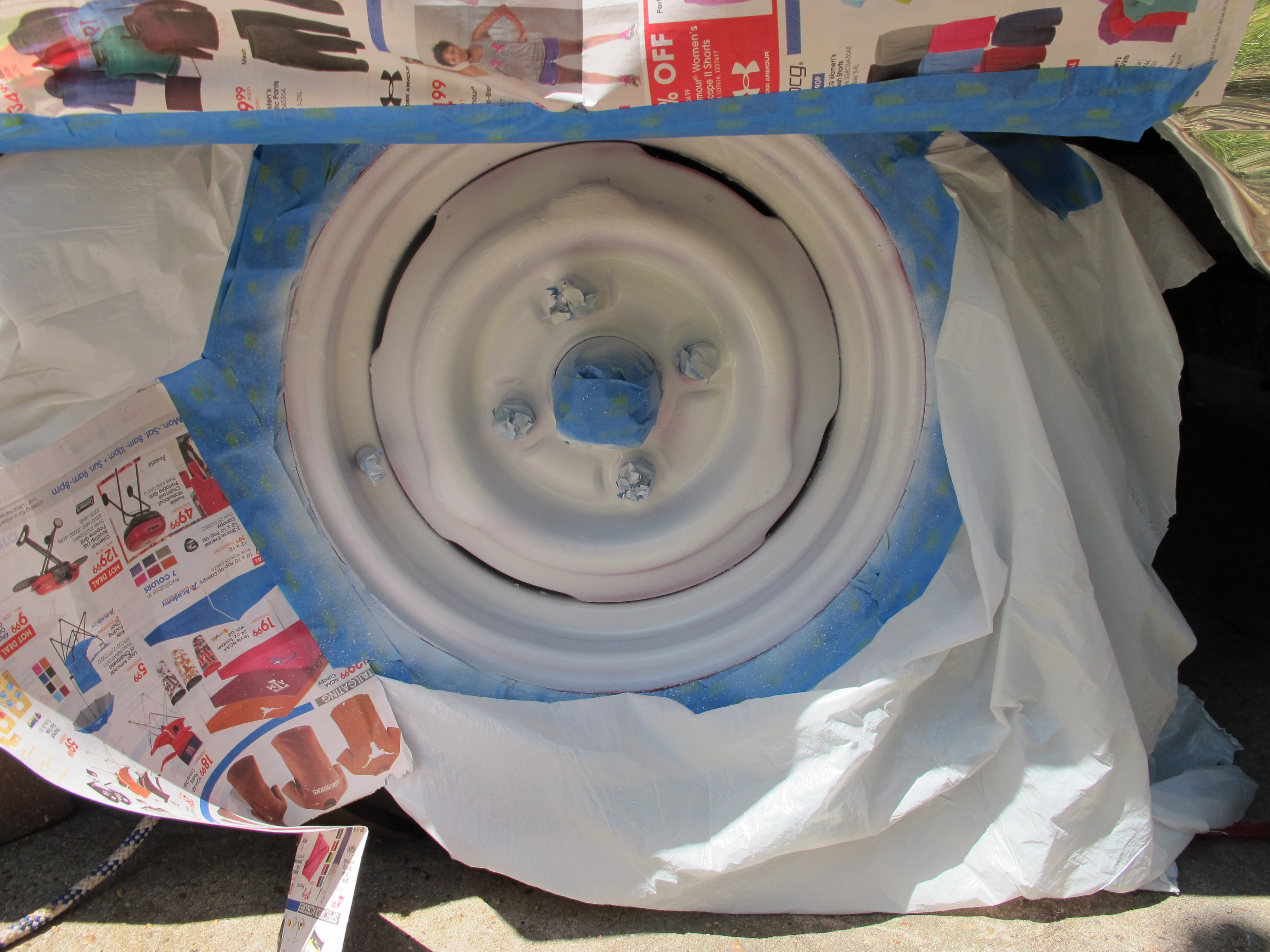 The first thing I did today was paint the wheels. The thing I hate about painting is all of the preparation that it takes. It took me much longer to prep the area for painting than it did to do the actual painting. Oh well, in the end, it was worth it! I think they look pretty. ![]()