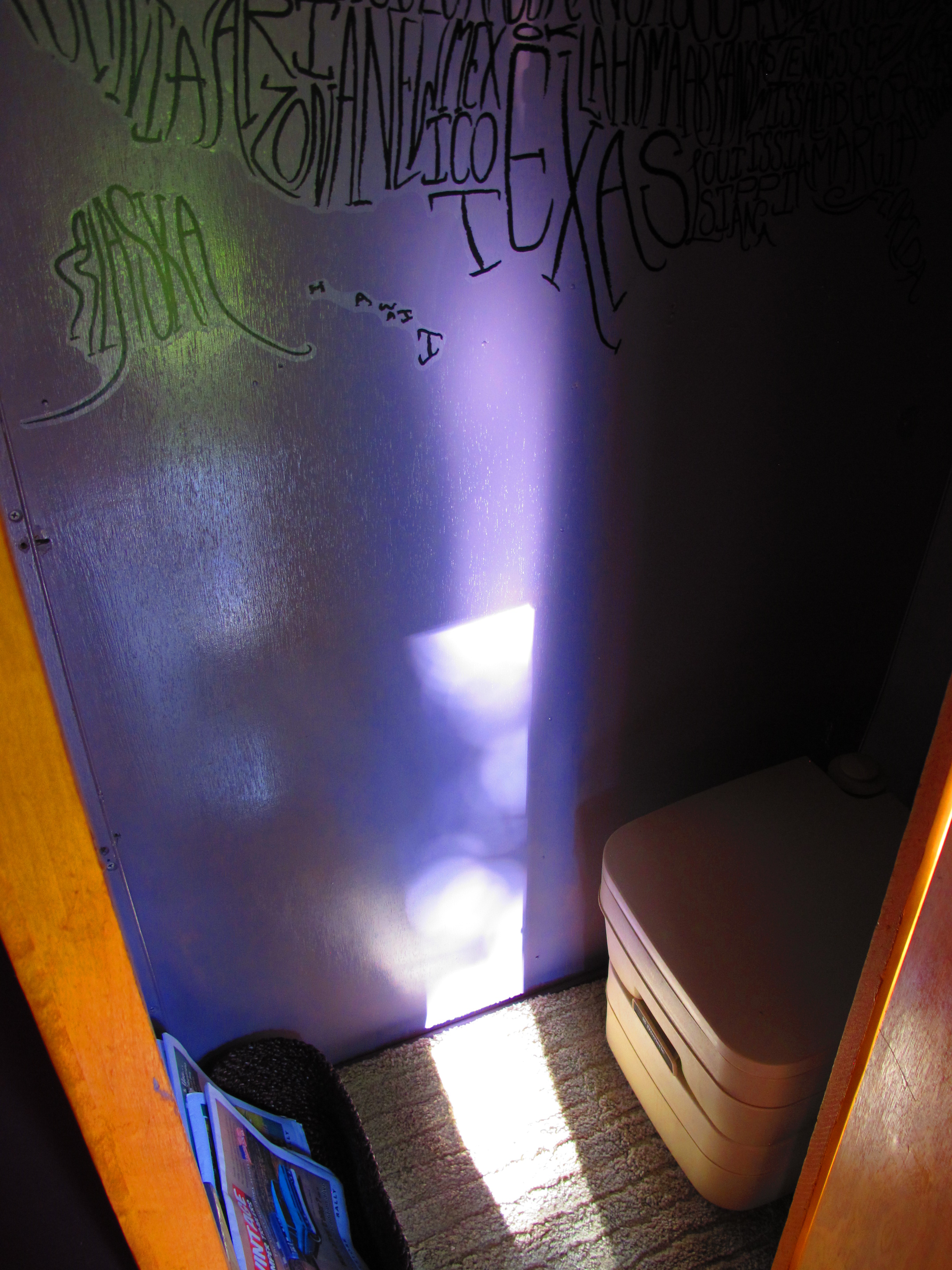 Little bathroom complete with vintage trailer reading material (not that I’ll be spending a lot of time in here). haha