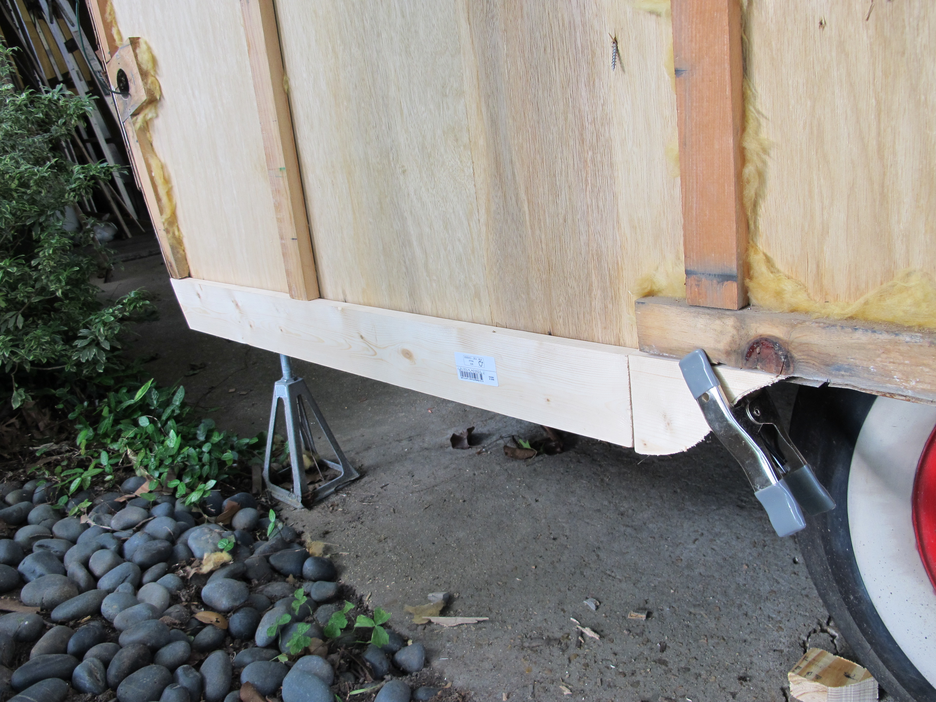 My friend and I also removed one of the support beams from under the camper and placed a new 2×4 there to replace it. I had to borrow my neighbor’s drill bit again because I didn’t have one long enough to drill through the 2×4 in order to put the carriage bolt through to secure the beams and subfloor to the frame. It’s all secure now!